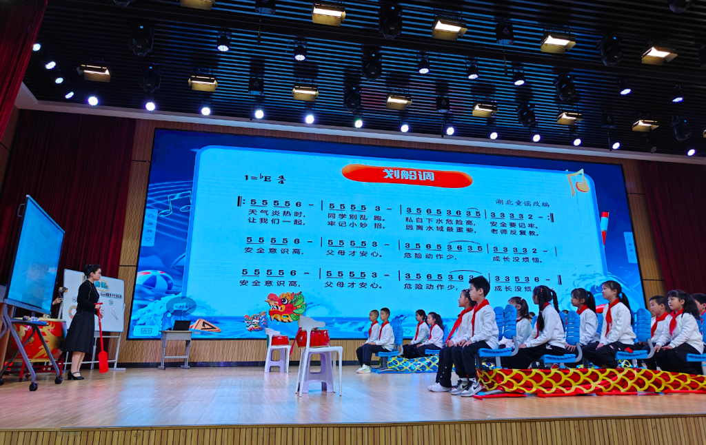 其中,防溺水主题课以荆楚龙舟文化为切入点,挖掘“敬畏自然、团结奋进”的文化内涵。课堂中,学生在老师引导下模拟“叫、叫、伸、抛”科学救援口诀,还能跟随AI生成的《划船调》节奏,手持“船桨”模拟龙舟竞渡,将防溺水知识与文化、法治意识融合。